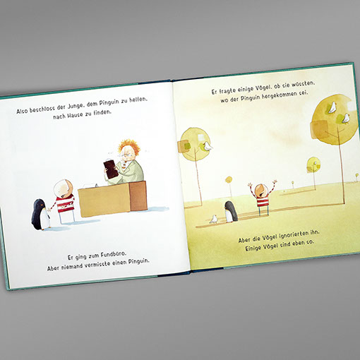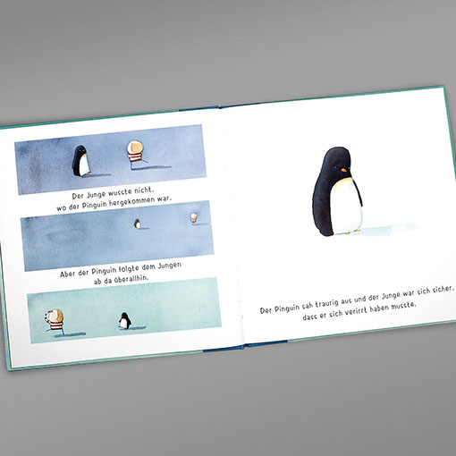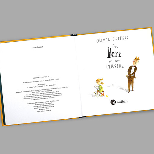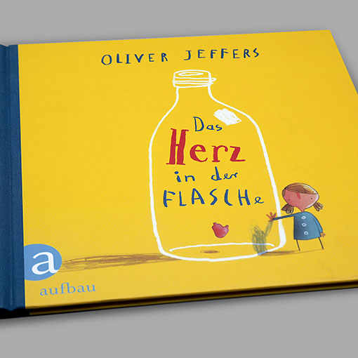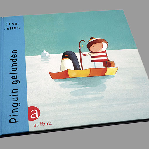 Aufbau Verlag | Bilderbuch Oliver Jeffers | Das Herz in der Flasche Oliver Jeffers | Pinguin gefunden Einband | Gestaltung, technische Umsetzung Inhalt | Gestaltung, Lettering, technische Umsetzung Einband | Konzept | Ute Henkel, Berlin Illustration & Text | Oliver Jeffers