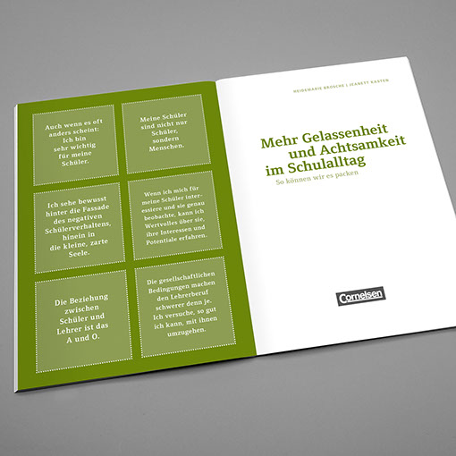 Cornelsen Verlag | Pädagogik Brosche | Flexibel handeln im Unterricht Brosche/Kasten | Mehr Gelassenheit und Achtsamkeit im Schulalltag Inhalt | Konzept, Gestaltung, technische Umsetzung Einband | Gestaltung, technische Umsetzung | Corinna Babylon, Berlin